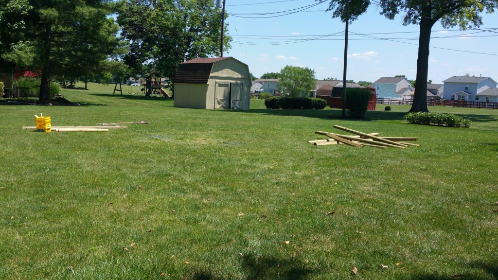 We laid the hog fence panel down where the cluster of containers had previously been (you can barely see it in this picture) to get a rough idea of where the bed was going to go. We orientated the bed so the length was facing south. We put the trellis on the north side of the bed. This way, when the climbing plants fill the trellis, they won’t shade the shorter plants in the afternoon. The spot has been chosen as the center of our yard is the only area on our property that gets all day sun.